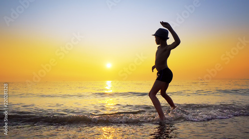 Silhouette of boy with hat throwing stones skipping on sea water surface. Summer vacation concept with vibrant orange sky