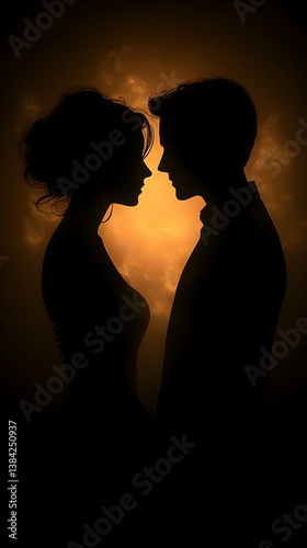 Silhouette of bride and groom facing each other set against a warm golden background Elegant and romantic with a sen