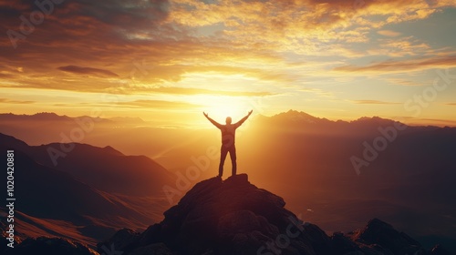 Silhouette of business male stand and feel happy on the most hight at the mountain on sunset, success, leader, teamwork, target, Aim, confident, achievement, goal, on plan, finish, generate by AI