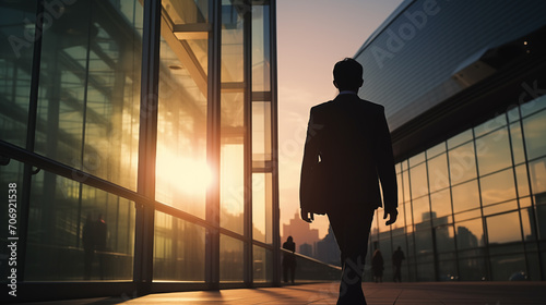 Silhouette of business man walking in office building with sun rays on background