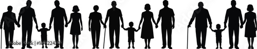 Silhouette of diverse people holding hands – adults, children, and elderly – black vector illustration symbolizing unity and community