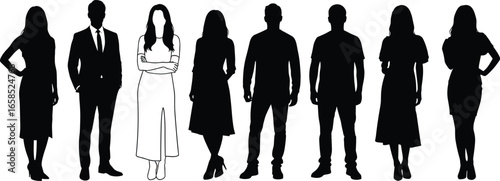 Silhouette of diverse people standing in casual and formal outfits, male and female figures vector illustration for stock content use