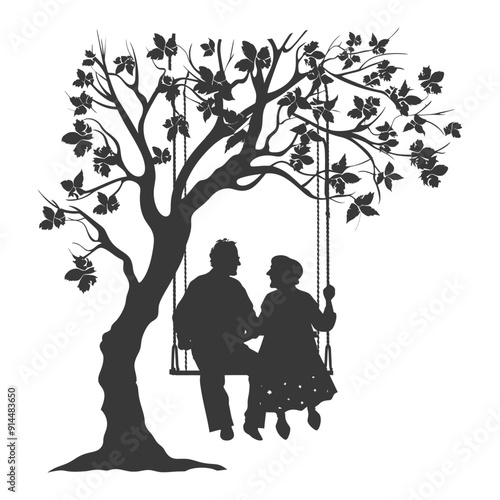 Silhouette of Elderly Couple Sharing a Moment on a Blossoming Tree Swing