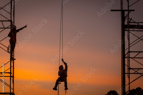 Silhouette of engineer and construction team working safely on scaffolding on high rise building. over blurred background sunset pastel for industry background with Light fair