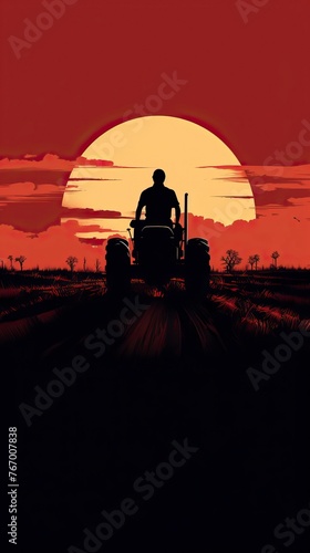 SIlhouette of farmer on tractor fixed with harrow plowing machine