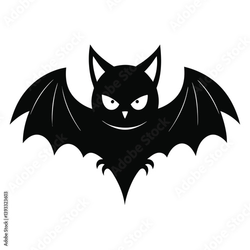 Silhouette of Flying Bat with Spread Wings, Pointed Ears, and Fangs on White Background