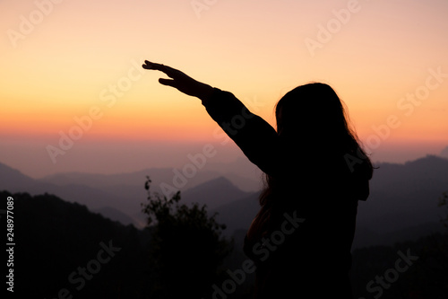 Silhouette of girl praying over beautiful sky background. Christian Religion concept background. fighting and victory for god