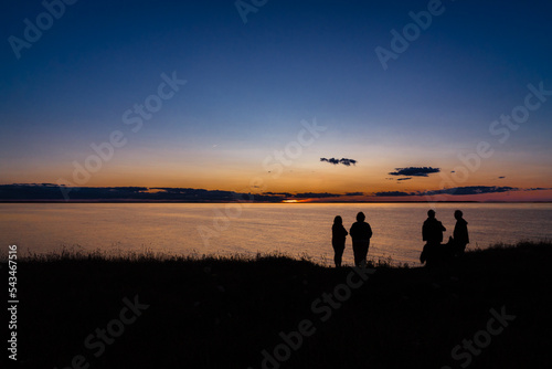 Silhouette of group of friends watching beautiful sunset at ocean.