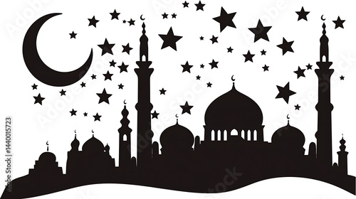 islamic, city, night, silhouette, mosque, star, moon, arabic, religion, muslim, islam, architecture, skyline, drawing, black, white, graphic, design, illustration, vector, art, background, image, wallpaper, decor, print, poster, spiritual, faith, culture, simple, serene, peaceful, religious, elegant, template, printable, wall, wallpainting, crescent, dome, minaret, beautiful, sky, nightlife, celebration
