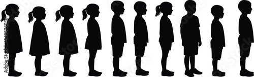 Silhouette of kids standing in line, children side view, boy and girl figures, black vector design, educational concept illustration