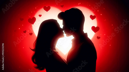 Silhouette of kissing couple on red heart background, romantic background. Concept of love man and woman, relationship romance, Valentine's day, date, passion, husband wife, honeymoon, greeting card