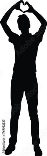 Silhouette of man making heart gesture with hands, love symbol, romantic positive body language, vector illustration on white