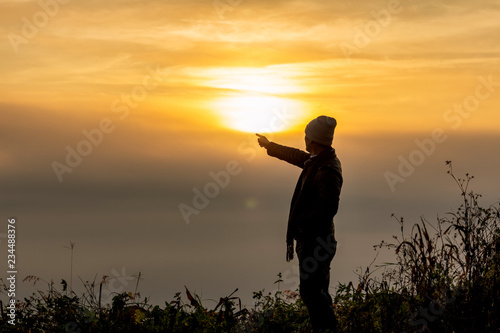 Silhouette of man standing on top mountain looks into the distance at morning misty landscape