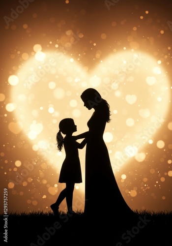 Silhouette of Mother and Child with Heart-shaped Bokeh Background