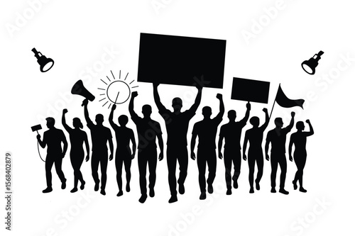 silhouette, protest, demonstration, crowd, people, signs, banner, flag, activism, movement, oneness, gathering, rally, march, public, expression, solidarity, social, political, statement, message, communication, awareness, change, action, community, group