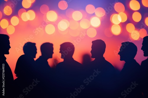 silhouette, people, group, discussion, meeting, gathering, communication, event, party, night, dark, man, crowd, talk, chat, conversation, blurred background, orange, light, bokeh, abstract, out of focus, anonymous, together, community, social