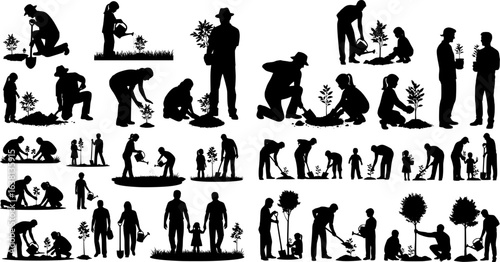 Silhouette of people planting trees various poses set collection. Family gardening and planting trees outdoor different poses silhouette set.