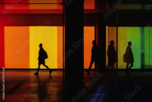 Silhouette of people walking against coloured wall background