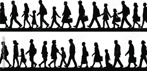 silhouette, people, walking, family, children, businessperson, commuter, group, diverse, black-and-white, line, pedestrian, crowd, community, population, urban, city, street, movement, lifestyle, manpower, professional, children, holding hands, stroll, casual attire, day, traveling, public, anonymous, society, urban life