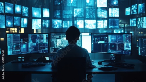 silhouette, person, control, room, futuristic, glowing, screen, technology, digital, datum, monitor, dashboard, blue, dark, artificial, intelligence, surveillance, security, command, center, processing, information, computer, system, transformation, innovation, engineering, programming, coding, hacking, network, connectivity, communication, age, future, high technology, advanced, industrial, modern, abstract, atmosphere, moody, cinematic