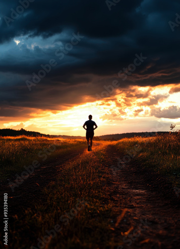 silhouette, running, sunset, path, determination, serenity, landscape, sky, cloud, nature, exercise, fitness, horizon, field, grass, evening, dramatic, light, shadow, solitude, journey, adventure, freedom, peaceful, dusk, countryside, trail, athletic, motivation, endurance, golden hour, scenic, inspiring