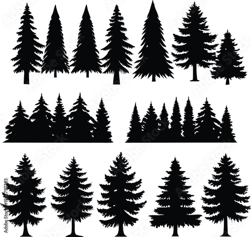 Silhouette of Pine Trees and Forest,black silhouette forest trees,evergreen pine trees,tall fir trees,detailed forest tree line,wilderness landscape,Vector Silhouette of Pine Trees and Nature,Ai