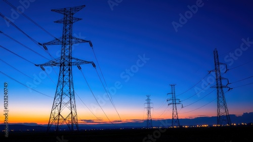 power, transmission, tower, electricity, silhouette, sunset, twilight, cable, wire, energy, grid, infrastructure, landscape, dusk, dawn, industrial, metal, pylon, transmission line, technology, modern, utility, horizon, sky, blue, orange, light, dark, rural, countryside, field, city, light, development, renewable, sustainable, environment, engineering, industry, construction, maintenance, safety, operation, efficient, accurateness, safe, secure, urban, growth