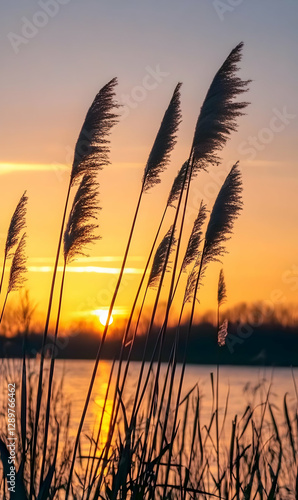 Silhouette of reeds against vibrant sunset sky reflecting on calm lake water