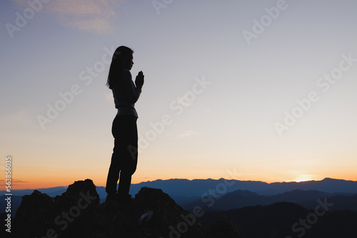 silhouette of Religious young woman praying to God in the morning, spirtuality and religion, Religious concepts