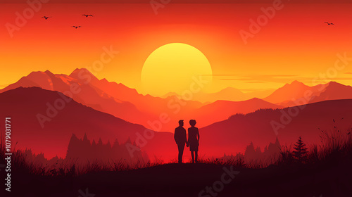 silhouette, romantic, couple, sunset, happy, anniversary, wallpaper, copy, space, text, illustration