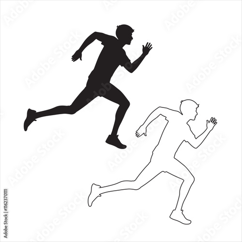 runner, running, sport, fitness, exercise, marathon, athlete, male, silhouette, black-and-white, dynamic, energetic, motion, healthy lifestyle, active, endurance, sprint, competition, activewear, activewear, running shoe, illustration, vector, graphic, line art, closeup, man, people, isolated, motivation, determination, sharpened, speed, effort, cardio, physical exercise, training, healthy, champion, lifestyle, summer, autumn