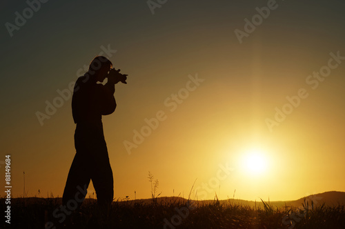 Silhouette of the photographer on a grassy horizon at sunset. Wooded mountains in the background.