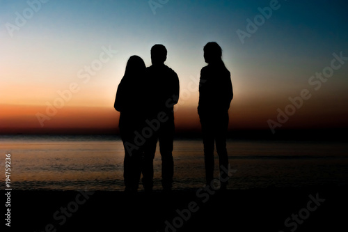 Silhouette of three friends in the morning at the beach looking at sunrise .