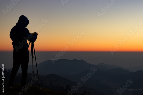 silhouette of Travel photographer standing with a camera mounted on a tripod and shooting a time lapse of the sunrise/sunset. man wearing his hood enjoying the mountain view /valley view