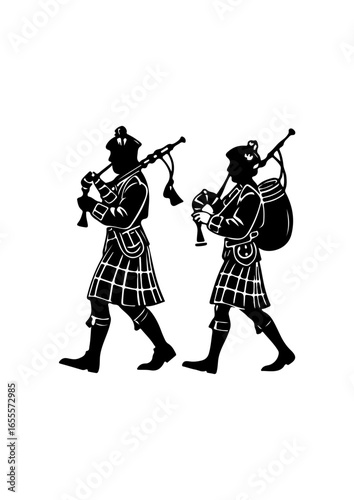 Silhouette of Two Bagpipers in Traditional Scottish Attire