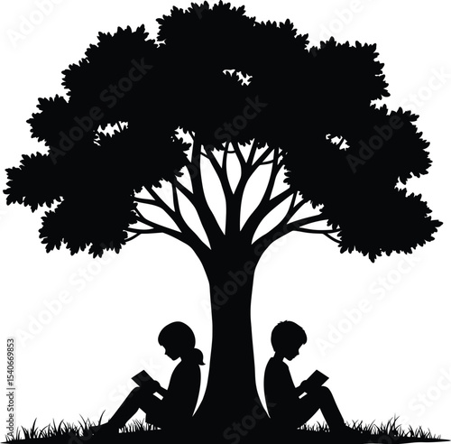 silhouette, children, reading, tree, book, education, nature, children, boy, girl, learning, childhood, park, cognition, friendship, sitting, grass, summer, student, literature, quiet, illustration, vector, peaceful, black, isolated, study, story, imagination, concept, people, foliage, relaxing, reader, love, couple, woman, children, spring, family, children, garden, flower, sky, happiness, play, romance