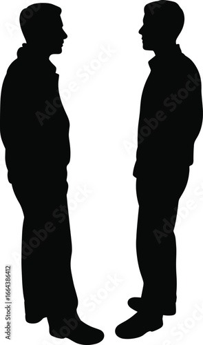 Silhouette of two men standing face to face, conversation, business meeting, discussion, communication, teamwork, colleagues, professional interaction