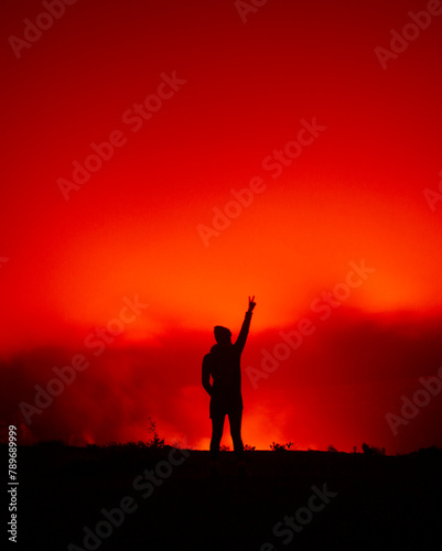 Silhouette of Woman Giving Peace Sign with Glow of Volcano at Night