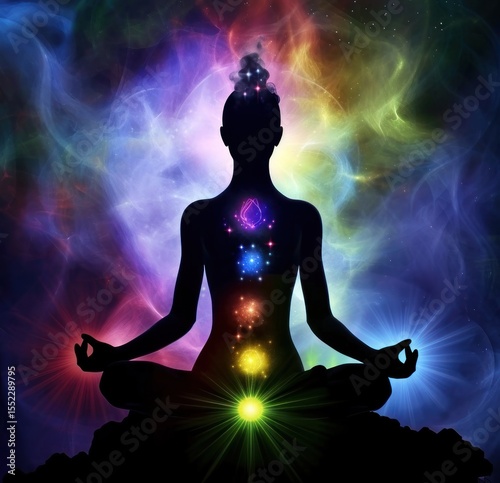 Silhouette of woman meditating in lotus pose with colorful lights. Meditation. Yoga. Buddhism. Guru Concept. Yoga Concept with Copy Space.