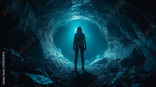 cave, silhouette, light, darkness, exploration, mystery, adventure, nature, shadow, depth, terrain, geology, ambience, solitude, discovery, environment, calmness, wonder, landscape, journey, illumination, echo, eerie, stillness, serenity, unknown, space, rock, formation, atmosphere, beauty, contrast, perspective, isolation, emotion, silence, escape, natural, vision, scene, woman, dark