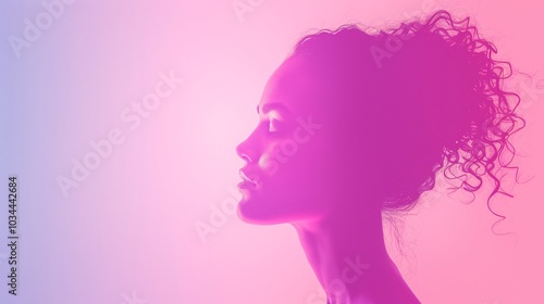Silhouette of woman with curly hair, pink and purple gradient overlay, side profile, artistic lighting, conceptual photography, minimalistic design, abstract style, soft copyspace.