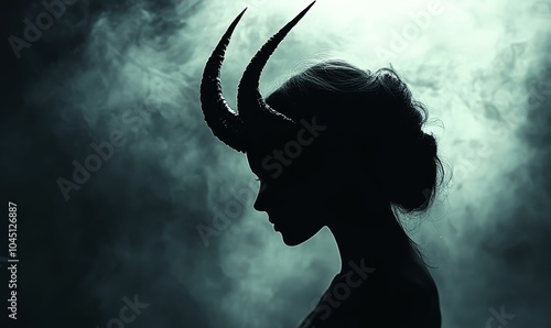 dark, silhouette, woman, horn, devil, daemon, mystical, fantasy, skittish, mysterious, smoke, foggy, dramatic, eerie, gothic, ominous, supernatural, shadow, witchcraft, magical, creature, powerful, fear, evil, forbidden, magic, danger, haunted, horror, unearthly