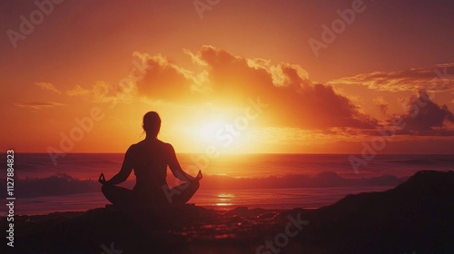 Silhouette of Yoga Practitioner Meditating at the Beach at Sunset