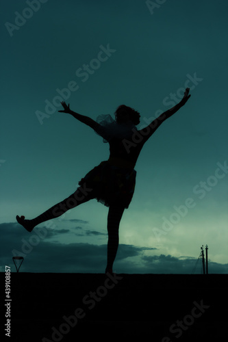 Silhouette of young ballerina dancing and having fun outdoors