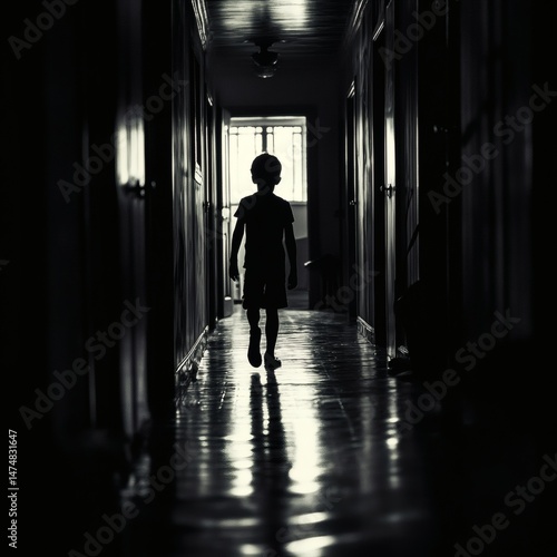Silhouette of Youngster Walking Down Dark Hallway Towards Glowing Exit, Showing Light Reflections on Polished Floor