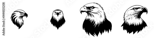 Silhouette pictogram set featuring various eagle head designs showcasing unique styles and expressions for graphic use