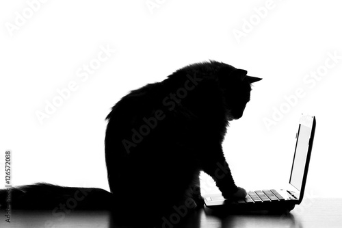 animal, cat, computer, laptop, pet, black-and-white, silhouette, technology, domestic, looking, kitten, isolated, background, cute, cyberspace, felino, beauty, mammal, communication, portrait, working, fun, sitting, studio, on, notebook, humor, net, theme, learning, monitor, keyboard, business, tablet, striped, toy, indoor, concept, watching, paw, dark, office, relaxation, studying, touching, fluffy, curiosity, equipment, playful