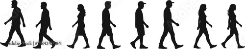 Silhouette vector illustration of diverse people walking in a row, showing casual movement, gender variety, and daily outdoor activity.