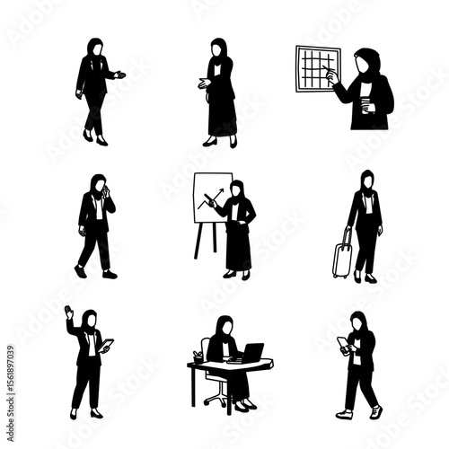 Silhouette Vector Set of Muslim Businesswoman. Minimalist Silhouette Vector of Hijabi Women in Professional Workplace.Hijabi Businesswoman Silhouette Illustration. Hand-drawn Vector of Hijabi Business