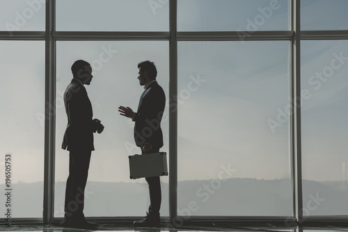Silhouette view of two young businessmen are standing in modern office with panoramic windows